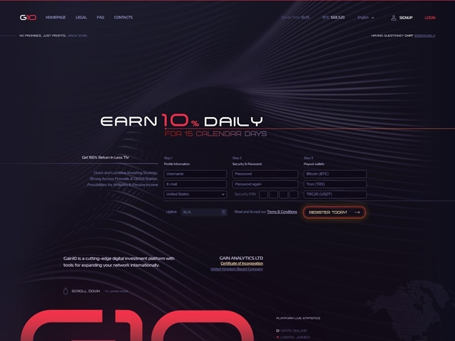 Description:Accepts: Bitcoin, Tron (TRX), USDT TRC-20Investment plans:Trading digital assets is Gain10's primary business activity. Our traders choose short positions since they produce the best returns when using automated tools and potent compounding algorithms that can generate quick gains in a matter of seconds. In G10 high-frequency trading, both human and artificial intelligence trading tactics are used. The NFTs, which have revived cryptocurrencies by fusing digital technology and art worth collection, have also sparked clever enhancements in our yielding process. Gain10 is at the top of the sector thanks to such exclusive solutions that allow us stay on top of the online investment market.